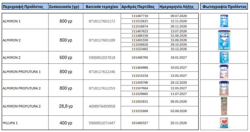 Μετά από ανακοίνωση, η εταρεία Nutrucia, προβαίνει σε ανάκληση παρτίδων βρεφικών προϊόντων, σύμφωνα με τον παρακάτω πίνακα: